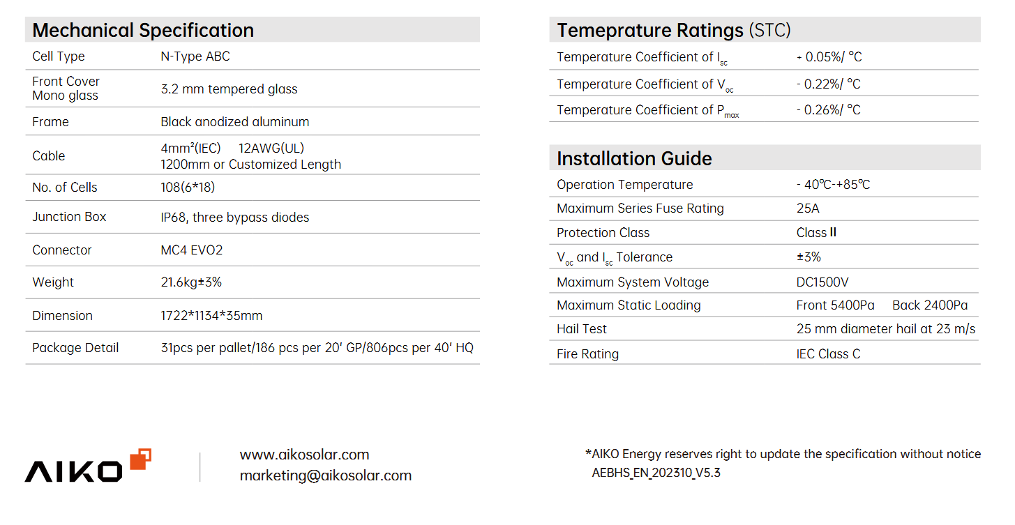 AIKO yra pasaulinės klasės saulės energijos technologijų kompanija, įkurta 2009 m., kuri specializuojasi tyrimuose, gamyboje ir sprendimuose fotovoltinės energijos srityje. Jos unikalioji „ABC (All-Back-Contact)“ technologija leidžia sukurti tikrai vientisą juodą paviršių moduliuose — be jokių matomų laidų ar kontaktų priekyje. AIKO turi integruotą vertikalų gamybos ciklą, kelis tyrimų ir plėtros centrus bei globalią prekybos ir aptarnavimo infrastruktūrą — tai užtikrina tiek inovacijas, tiek patikimumą.
